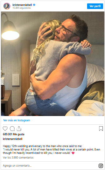 La actriz estadounidense Kristen Bell fue blanco de críticas en redes sociales tras compartir, el 18 de octubre, una publicación por su 12.º aniversario de matrimonio con el actor Dax Shepard.