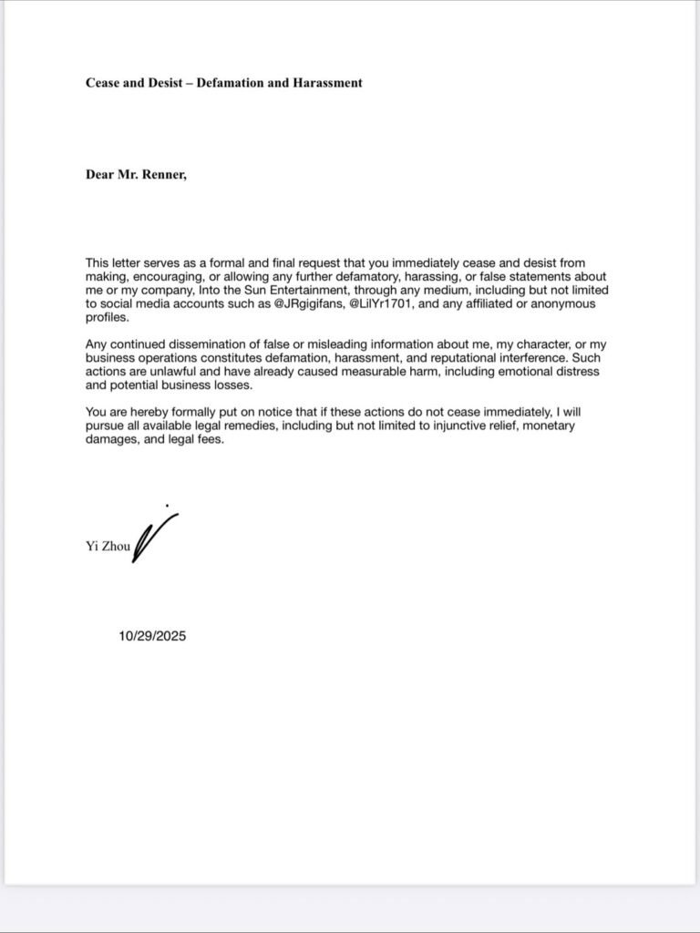 Zhou envió varias cartas al actor solicitando el cese de los abusos y la intimidación. En ellas, le exige detener cualquier tipo de hostigamiento, amenazas o interferencias con su carrera profesional.