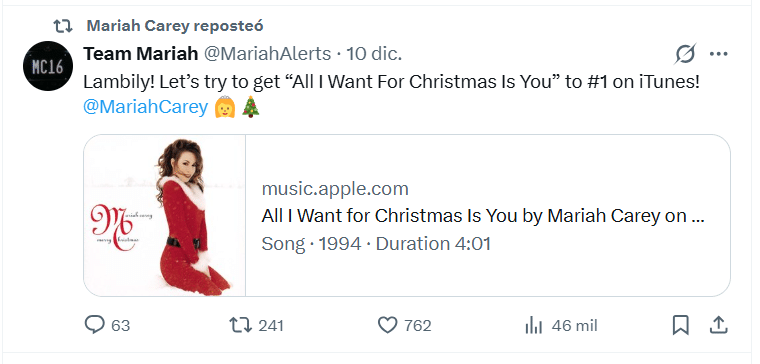 Tras conocerse el nuevo récord, Carey reaccionó a través de sus redes sociales, donde agradeció el respaldo del público por llevar nuevamente su canción a la cima durante la temporada decembrina.