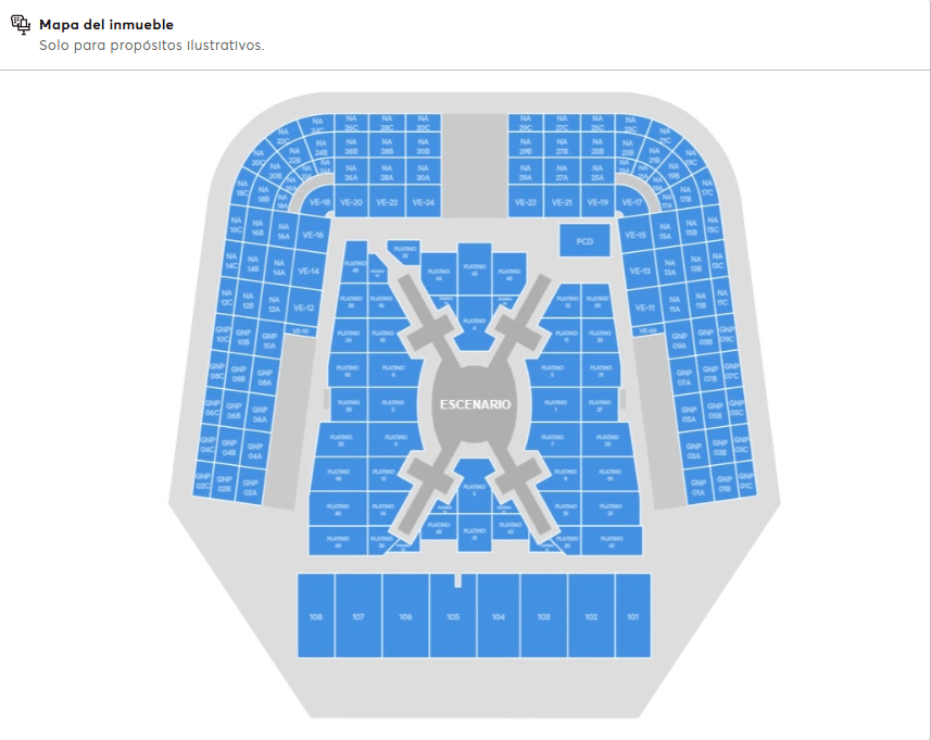 El resto del recinto se divide en secciones GNP, NA, VE, PCD y bloques 100s, todos con asiento asignado, tanto en cancha como en gradas.