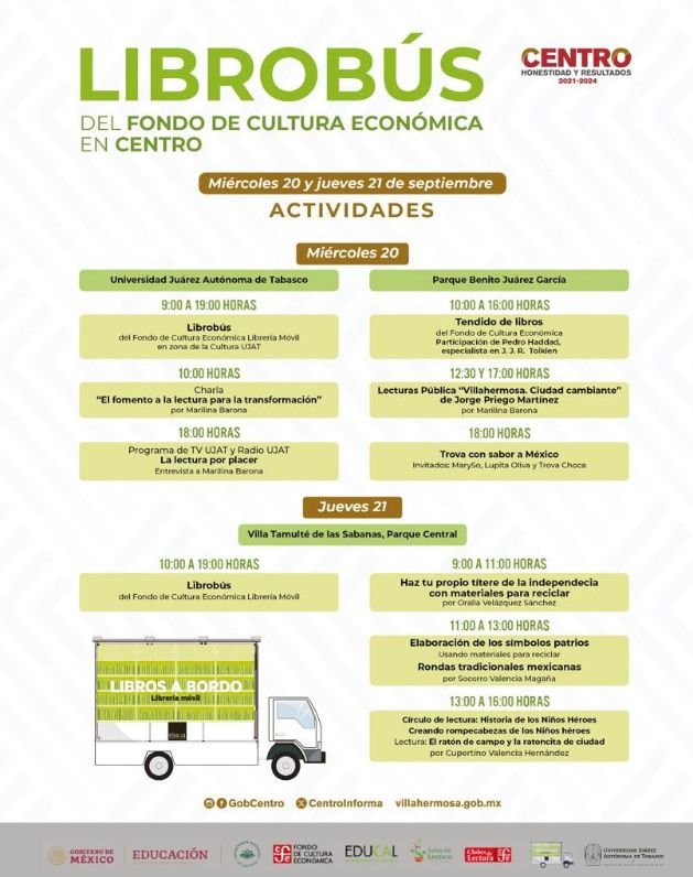 El jueves 21 de septiembre, el Librobús del FCE se trasladará hasta el parque Central de la Villa Tamulté de las Sabanas, donde permanecerá de 10:00 a 19:00 horas.