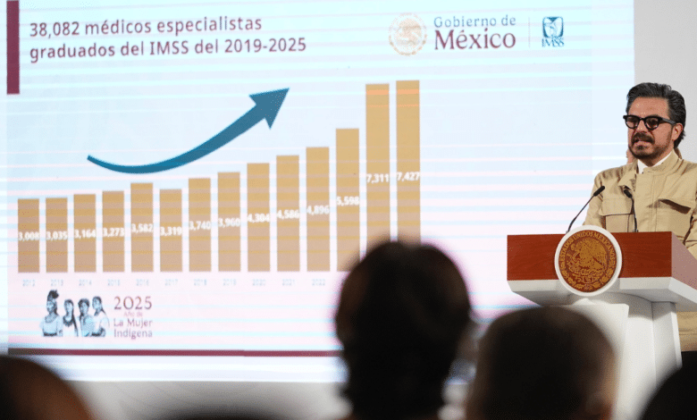 Refirió que 2019 a 2025, el incremento de residentes pasó de 15 mil a 26 mil en todos los años; se incrementó la contratación de médicas y médicos profesores, titulares y adjuntos para llegar a 5 mil 212; las sedes de formación pasaron de 200 a 389 al fortalecer este proceso en Hospitales de Generales Zona y de Sub-Zona, así como en Unidades de Medicina Familiar.