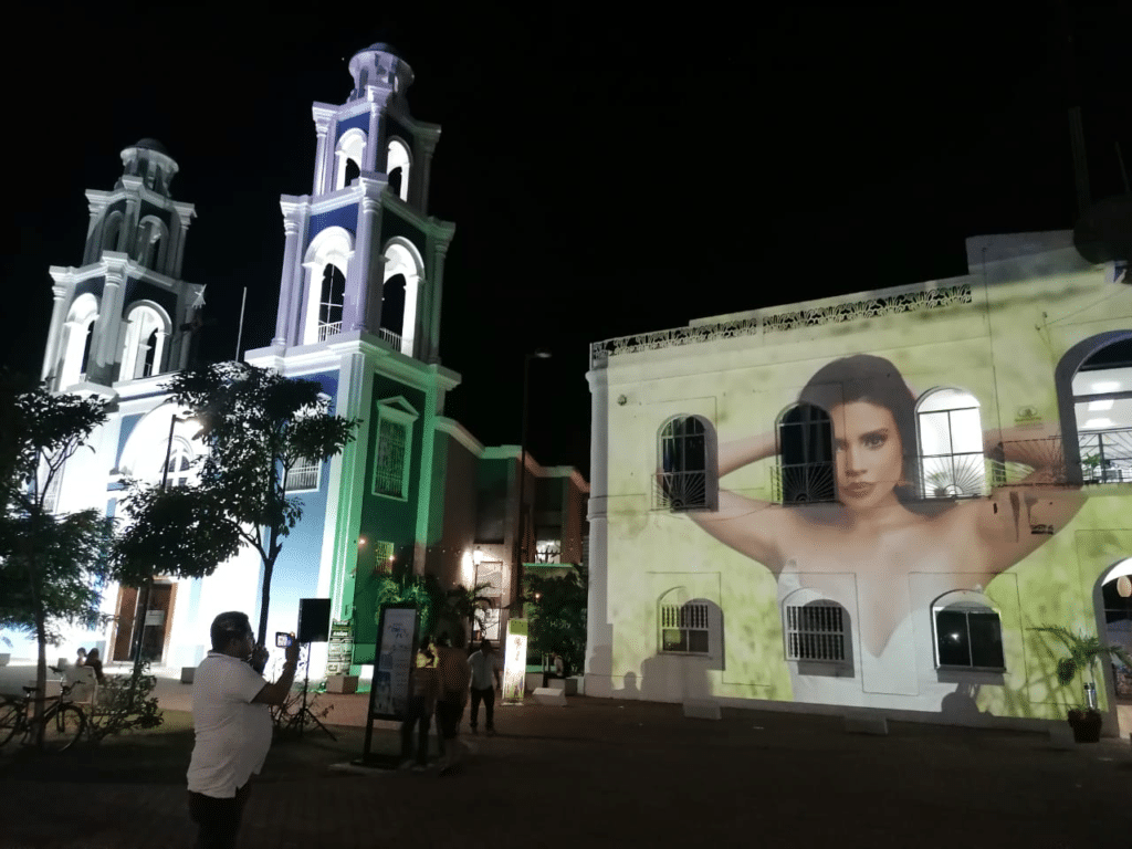 • La fachada del Palacio Municipal se convirtió en una gran pantalla donde se proyectó una calurosa bienvenida a cada una de ellas, así como un video de Bianca Chargoy