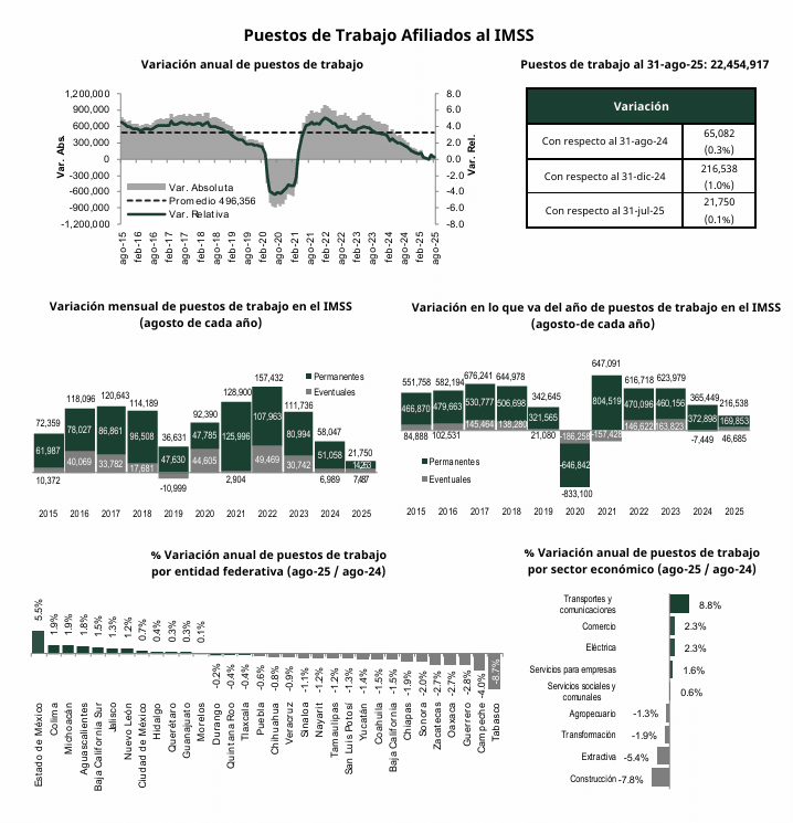 Al cierre de agosto 2025, el salario base de cotización promedio de los puestos de trabajo afiliados al IMSS alcanzó un monto de $630.7 (seiscientos treinta punto siete pesos), el segundo más alto desde que se tenga registro.
