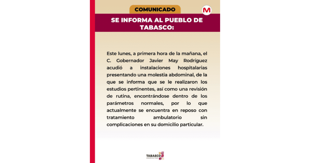 El Gobierno de Tabasco informó que la mañana de este lunes, el gobernador Javier May Rodríguez acudió a una revisión médica tras presentar una molestia abdominal.