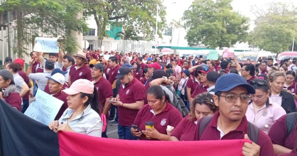 Ante la declaratoria de improcedencia de su movimiento huelguista, cientos de trabajadores administrativos marchan en Villahermosa para exigir el 20% de aumento salarial y denunciar el colapso del servicio médico.