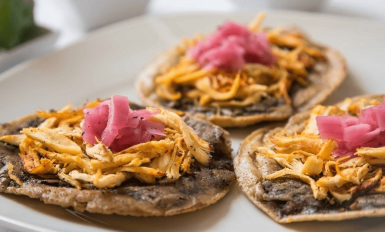 - Montar los panuchos: Coloca las tortillas rellenas en un plato y añade una capa de carne de cerdo deshebrada. Decora con cebolla morada, hojas de lechuga, rodajas de tomate y aguacate.