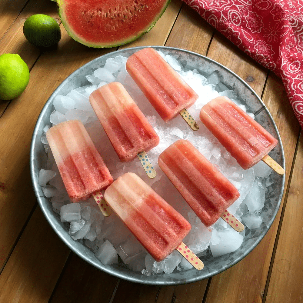 Recetas como la “Watermelon Margarita Popsicles” recrean ese gradiente bonito y refrescante, con toque adult-friendly, sin exceso de azúcar