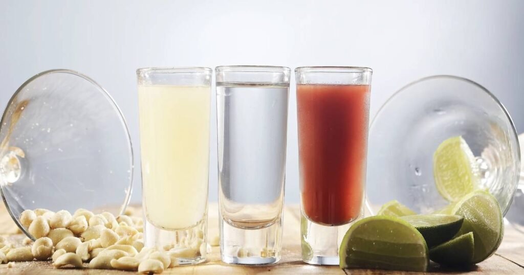 • Ingredientes: Tres caballitos: uno con tequila blanco, otro con jugo de limón, y otro con sangrita.