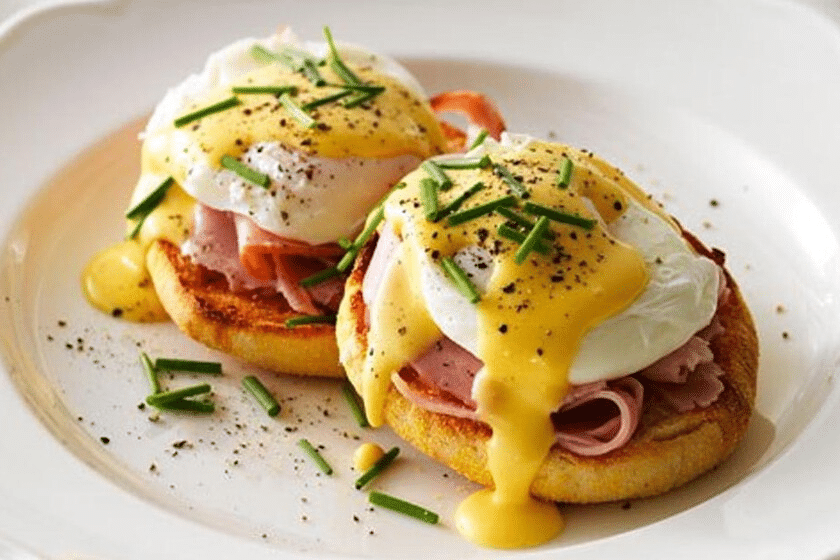 4 huevos, 2 muffins ingleses, 4 rebanadas de jamón o tocino canadiense, 3 yemas, ½ taza de mantequilla derretida, 1 cucharadita de jugo de limón, sal y pimienta.