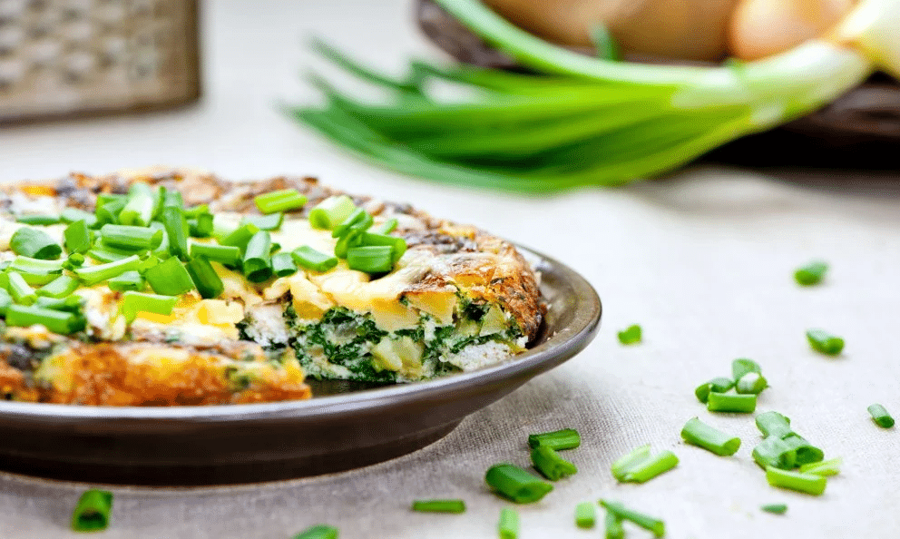 Bate los huevos con sal y pimienta. Sofríe la cebolla y las espinacas en una sartén apta para horno. Agrega el huevo batido y el queso feta. Cocina a fuego bajo hasta que se fije el borde. Lleva al horno precalentado a 180 °C durante 10 minutos o hasta que el centro esté firme. Deja reposar y corta en porciones.