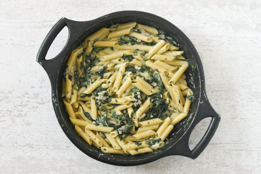 Un platillo de inspiración italiana, adaptado al presupuesto.La pasta es económica y rendidora. Se mezcla con espinacas salteadas, ajo y un poco de crema o queso. Es rápido, nutritivo y perfecto para aprovechar ingredientes básicos.