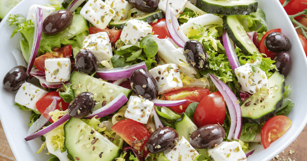 Ensalada griega tradicional: con tomates frescos, pepino, aceitunas, queso feta y aceite de oliva.