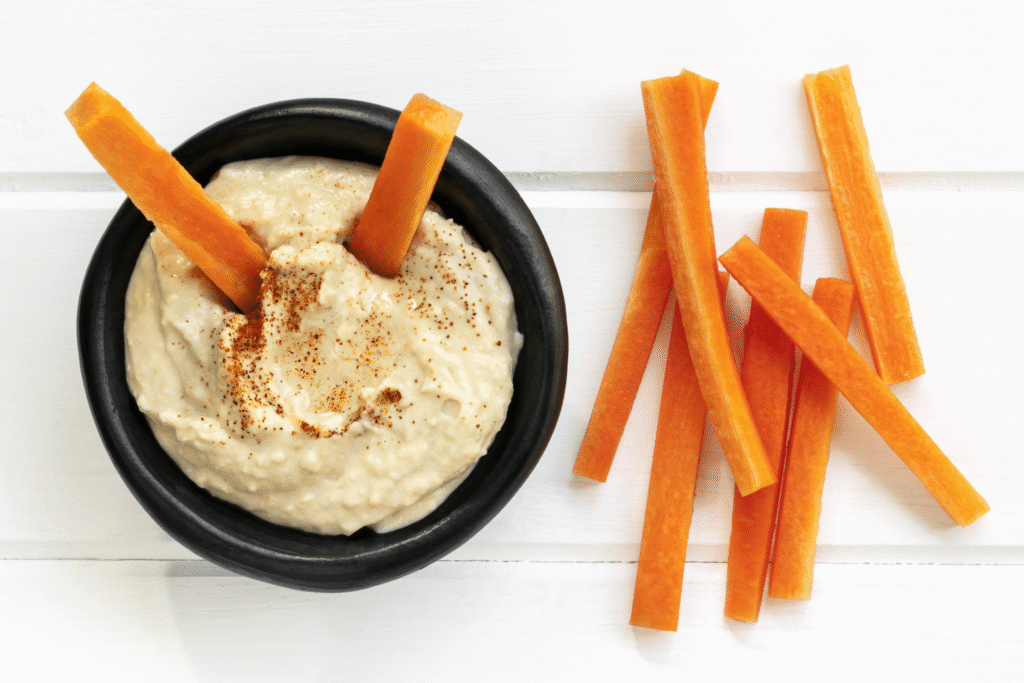 Hummus con vegetales crudos: puré de garbanzos con tahini y acompañamiento de zanahoria o apio.