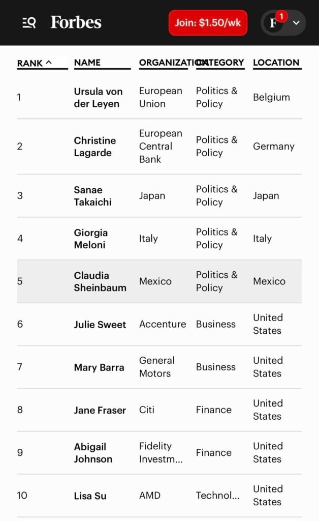 Forbes describe a Sheinbaum como la mujer que “hizo historia al ser elegida la primera presidenta de México con una victoria aplastante en junio de 2024. Su toma de posesión ese octubre fue recibida con vítores de ‘Presidenta’”. La publicación también destaca su trayectoria académica, recordando que es “una científica reconocida con un doctorado en ingeniería energética, y una de las investigadoras y legisladoras que compartieron el Premio Nobel de la Paz 2007 por su participación en el panel climático de la ONU”.