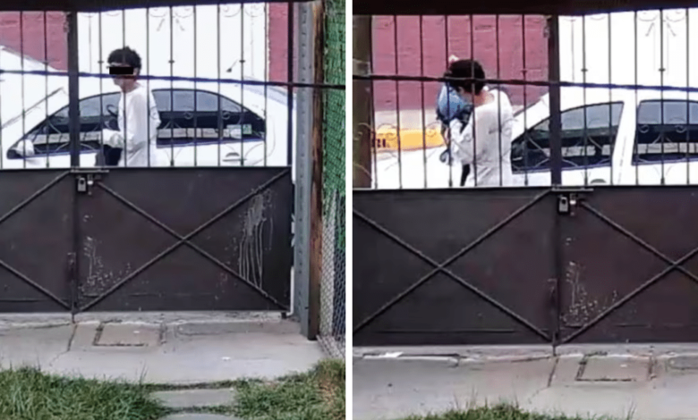 Las imágenes captadas por una cámara de seguridad muestran a un joven deteniéndose junto a un vehículo blanco en la calle Fuente de Ópalo. Luego, se agacha y deja una bolsa azul sobre la banqueta antes de retirarse del lugar.