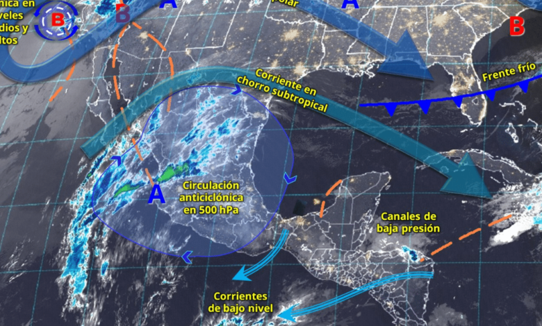 Asimismo, se prevén lluvias aisladas en Baja California. Por otra parte, un canal de baja presión en el sureste mexicano, aunado al ingreso de humedad de ambos océanos, propiciará chubascos en Chiapas y lluvias aisladas en Oaxaca, Veracruz, Tabasco, Campeche y Quintana Roo. Finalmente, una circulación anticiclónica en niveles medios de la atmósfera y el bajo contenido de vapor de agua, mantendrán baja probabilidad de lluvia y ambiente vespertino caluroso a muy caluroso en la mayor parte de la República Mexicana.