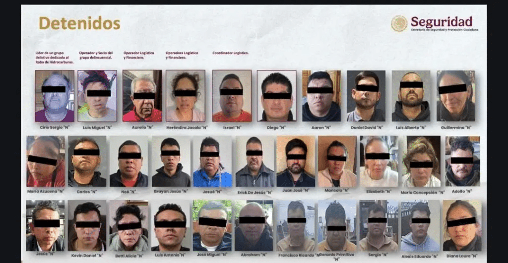 En una primera intervención, se logró la captura de 32 personas presuntamente involucradas en una estructura delictiva que operaba en Ciudad de México, Estado de México y Querétaro. La red extraía gas LP y gasolina mediante tomas clandestinas, almacenaba el combustible en bodegas, y lo distribuía a través de una red ilegal de gasolineras.