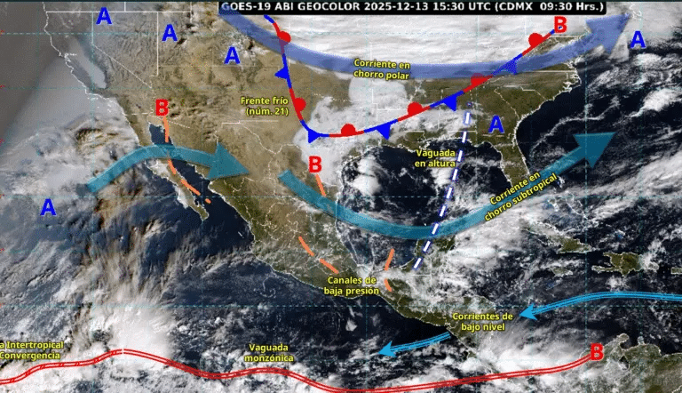 El Servicio Meteorológico Nacional (SMN) ha emitido una alerta para este lunes 15 de diciembre de 2025, debido a la presencia del Frente Frío número 21, el cual se extenderá con características de estacionario sobre el centro del Golfo de México. Este fenómeno, en interacción con un canal de baja presión ubicado en el sureste del país y el ingreso de humedad del Océano Pacífico, generará condiciones climáticas adversas que incluyen precipitaciones de variada intensidad, fuertes rachas de viento y un notable descenso en las temperaturas en gran parte del territorio nacional.