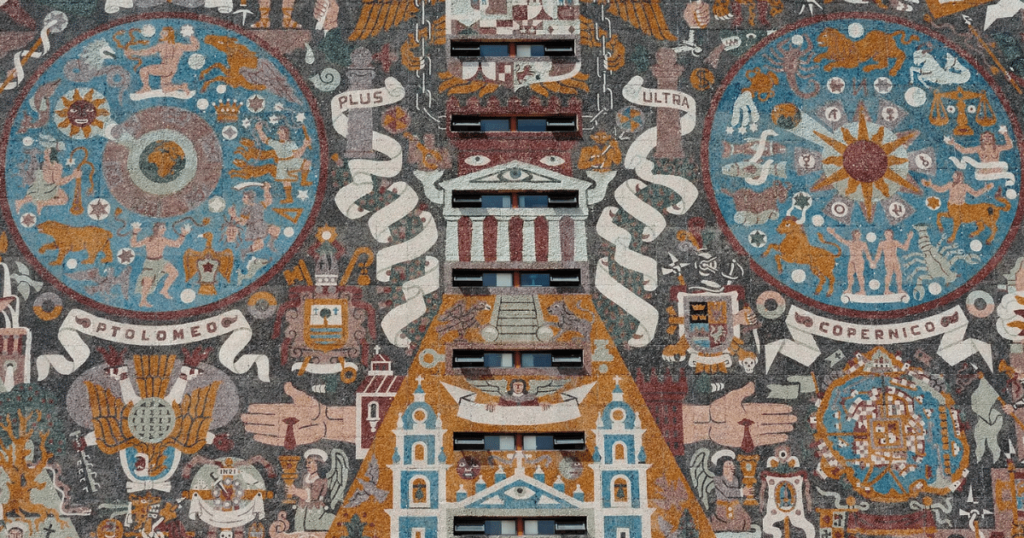 Uno de los aspectos más distintivos de la Biblioteca Central es su envolvente mural en mosaico de piedra natural, obra de Juan O’Gorman, quien transformó el concepto original de una caja de cristal por un lienzo arquitectónico que funcionara como un “libro abierto”.